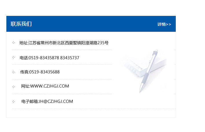 地址:常州市新北區友邦商務大廈1幢16、17層  電話:0519-85101652  傳真:0519-85112595  郵編:213022  網址:www_cz-jiayue_cn.chuanbojiagong.com  郵箱:xiajifengaa@163.com